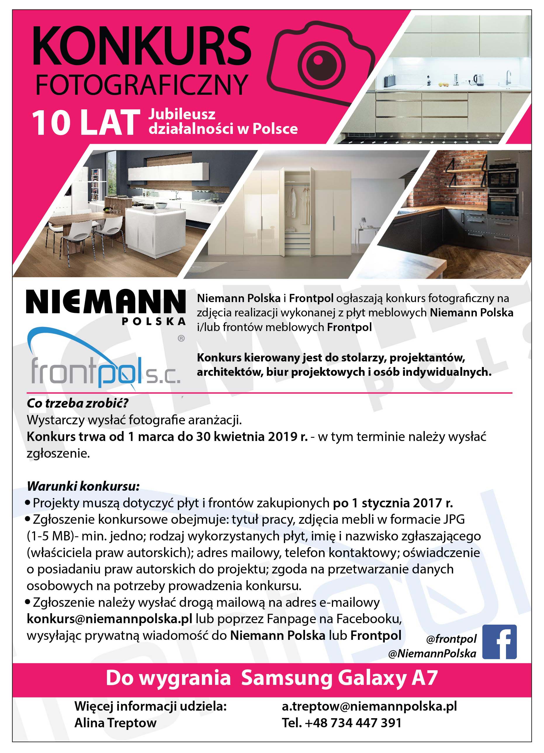 Niemann Polska i Frontpol świętują jubileusz 10-lecia działalności, a tym samym dekadę owocnej współpracy. W związku z tym ogłaszamy wyjątkowy konkurs kierowany do stolarzy, projektantów, architektów, biur projektowych i osób indywidualnych, którzy użyli w realizacji swojego projektu płyt meblowych Niemann Polska i/lub frontów meblowych spółki Frontpol.